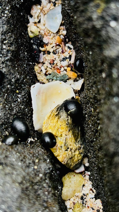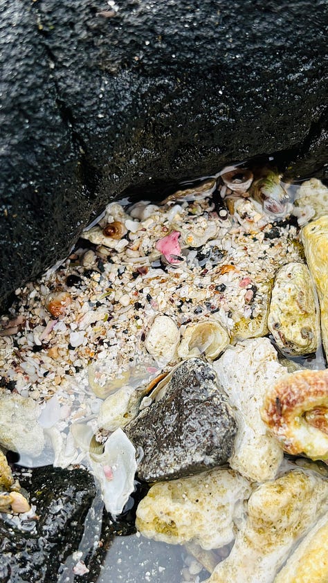 Giddily, I started searching for treasure, sinking my hands into the sand and letting it slip through my fingers like water made of land. There was much more color in these broken shells than it had seemed from afar: the discreet beauty found by telescopes to the stars.